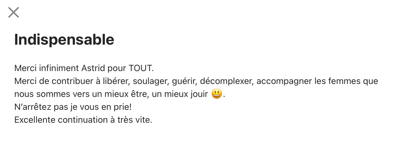 Je suis Astrid, kiné spécialisée en santé féminine, formée en sexothérapie, et passionnée par tout ce qui touche au corps et à l’intime.